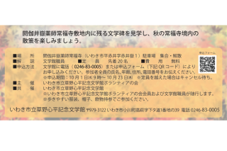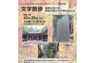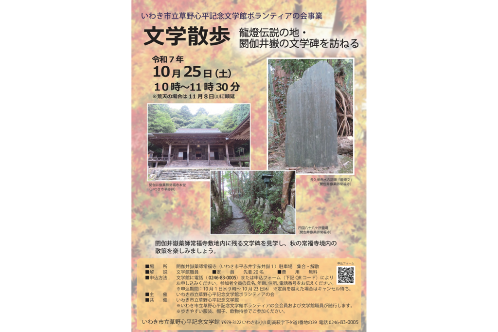 10月25日(土)、いわき市立草野心平記念文学館では、文学散歩「龍燈伝説の地・閼伽井嶽の文学碑を訪ねる」を開催いたします。閼伽井嶽薬師常福寺敷地内に残る文学碑の見学し、秋の常福寺境内の散策を楽しみましょう。歩きやすい服装、帽子、飲物持参でご参加ください。