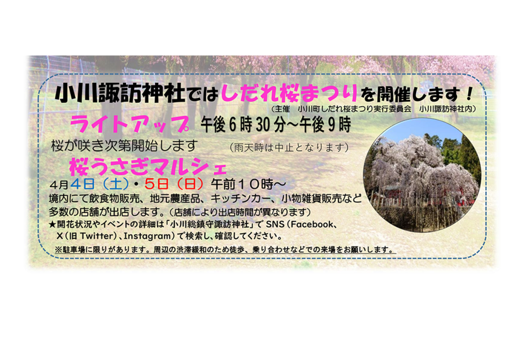 また、4月5日(日)は小川公民館前において、地元小川町産のそば粉を使用した手打ちそば、地元新鮮野菜、コーヒー等の販売を行います。