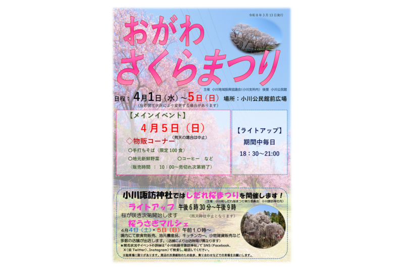4月1日(水)~4月5日(日)までの期間中、小川公民館にて「おがわさくらまつり」が開催されます。