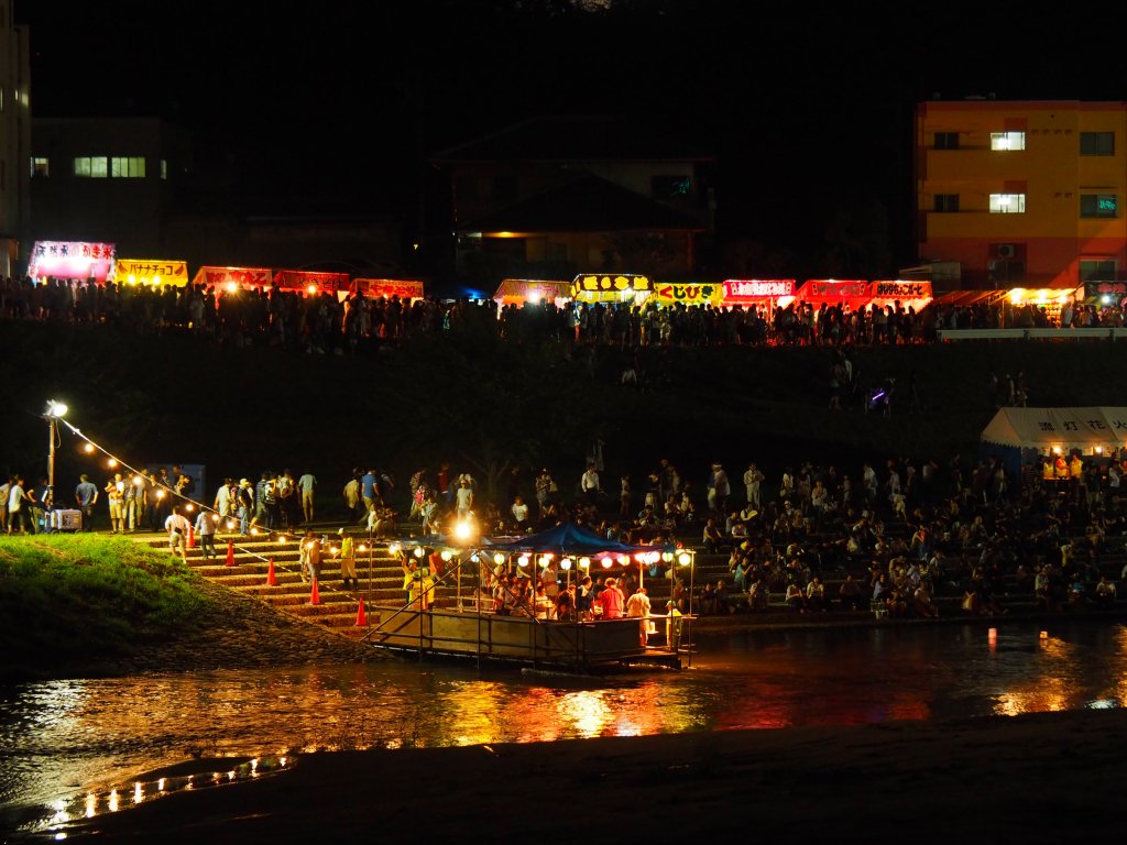 川施餓鬼供養後、日が暮れ始めると約2,000個の灯籠が夏井川を流れ、梅ヶ香盆囃子、じゃんがら念仏踊、笠踊りが奉納されます。そして最後に、夜空を飾る花火が約3,000発打ち上がります。