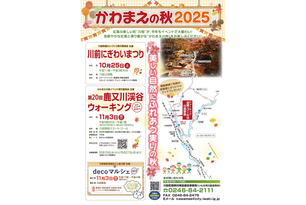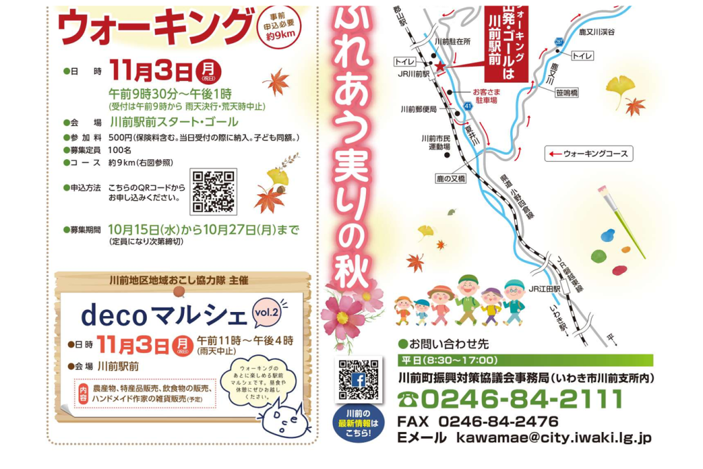 鹿又川渓谷のおだやかな清流は十和田の奥入瀬に似ており、広葉樹が多く、美しい紅葉の景色を堪能できます。イベント当日は川前駅前をスタート・ゴール地点とする約9キロのコースを歩きます。また、川前駅前では「decoマルシェvol.2」を同時開催!!川前の農産物や特産品、飲食物の販売が行われますので、ウォーキングのあとにぜひお立ち寄りください。
