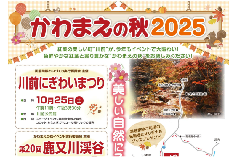 この他、10月25日(土)には川前公民館にて「川前にぎわいまつり」が催され、ステージイベントや農産物・特産品の販売、コロッケやアルコール等のドリンクも並びます。