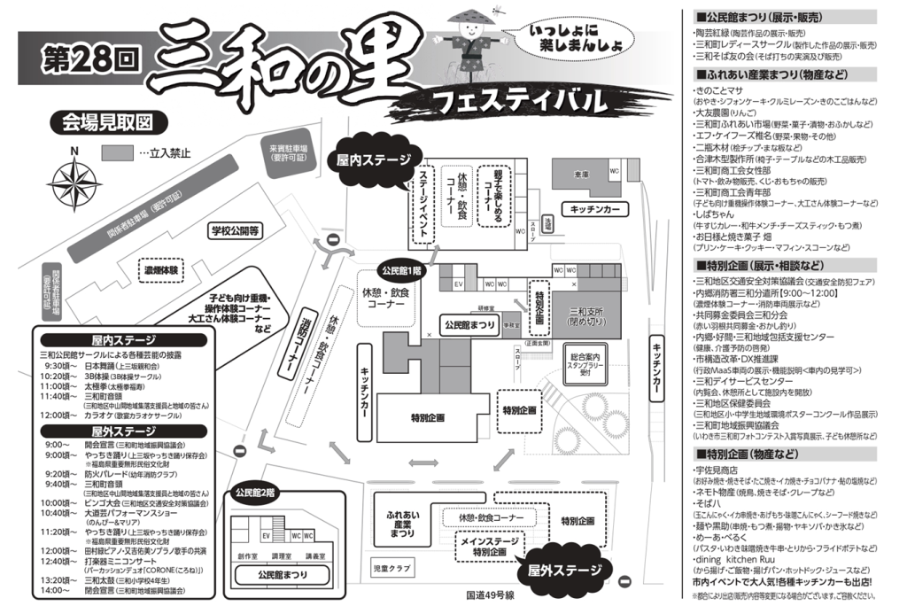駐車場 | 会場レイアウトに伴い、三和ふれあい館駐車場には駐車できません。旧沢渡小グラウンド、JAさくら三和支店、三和ふれあい市場(會津とらや隣)等をご利用ください。 |