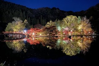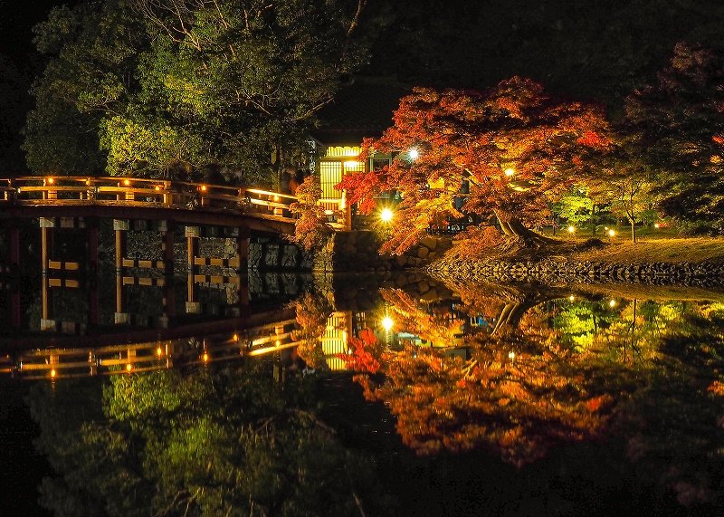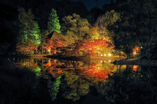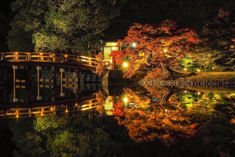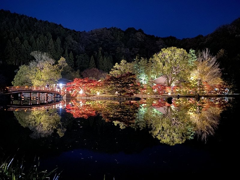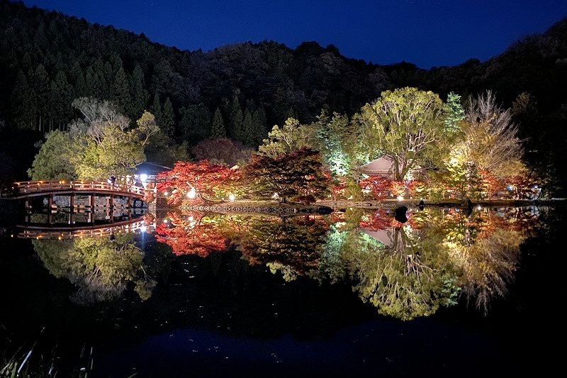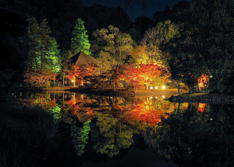 浄土庭園では、ライトアップされた紅葉が水面に映り込み、思わず息をのむ美しさが広がります。