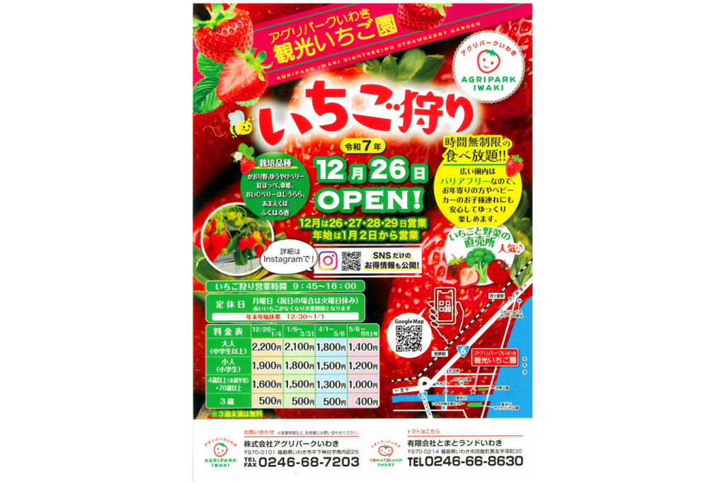 アグリパークいわき観光いちご園では、2025年12月26日(金)よりいちご狩りがスタート!