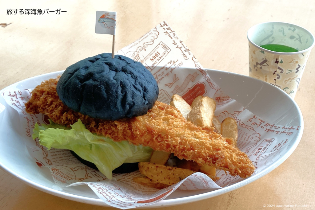 深海をイメージした黒いバンズに大きなマダラのフライをはさんだバーガーです。