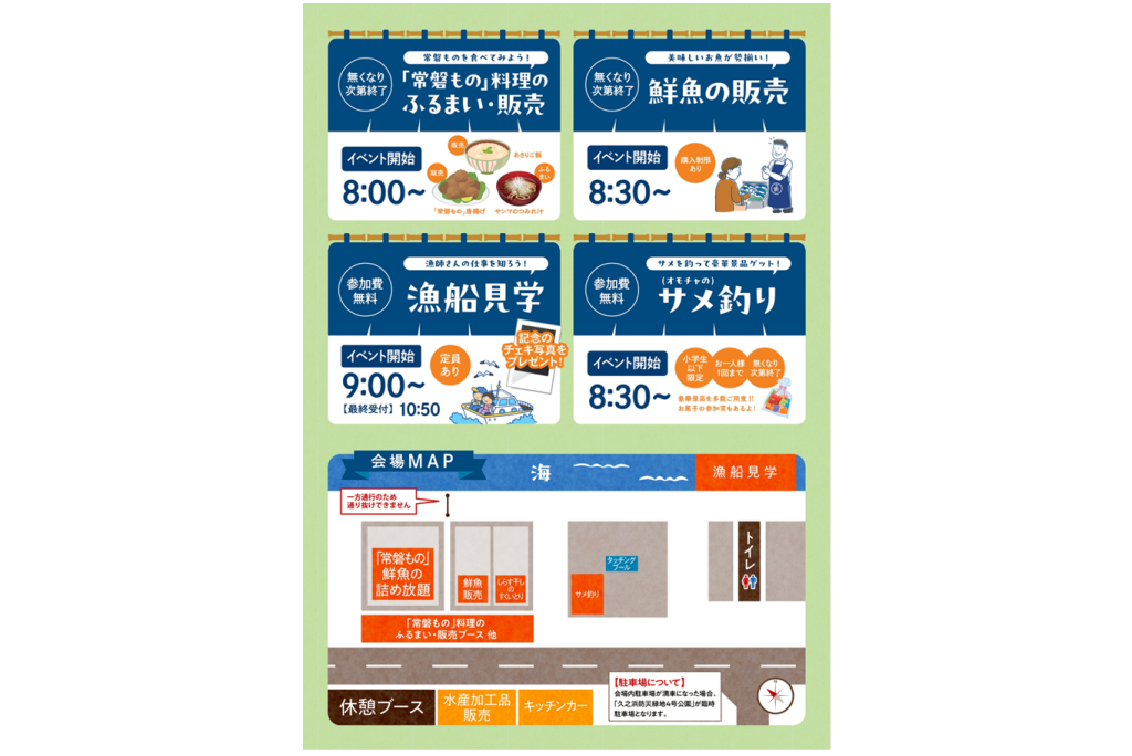 | 備考 | 【主催】 いわき市漁業協同組合・久之浜支所女性部 ※海況等により、イベントスケジュール・実施内容が変更、中止となる場合がございます。 ※イベントの開催・中止は前日の午前中に判断し、いわき市漁業協同組合の公式WEBサイトに掲載しますのでご確認ください。お電話による問い合わせには対応できません。 |