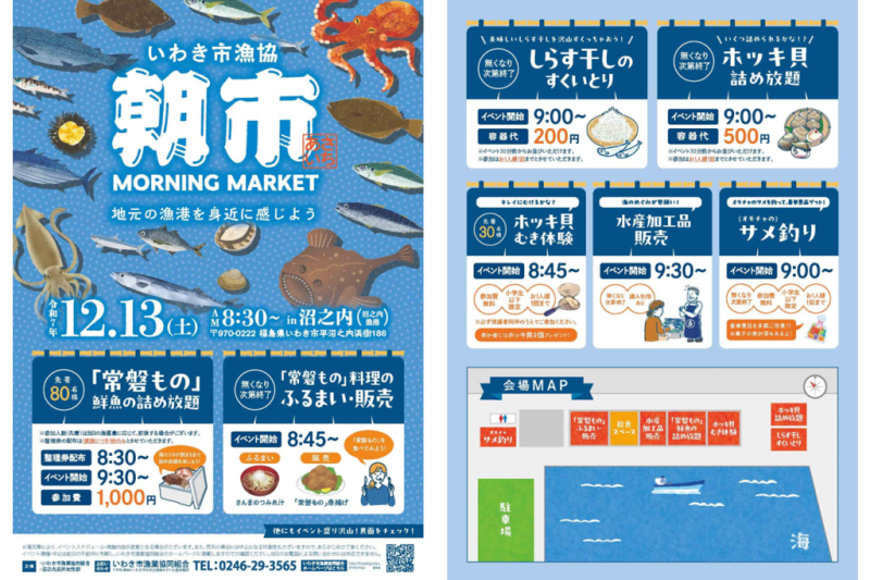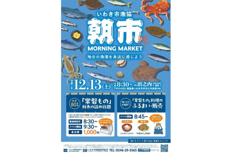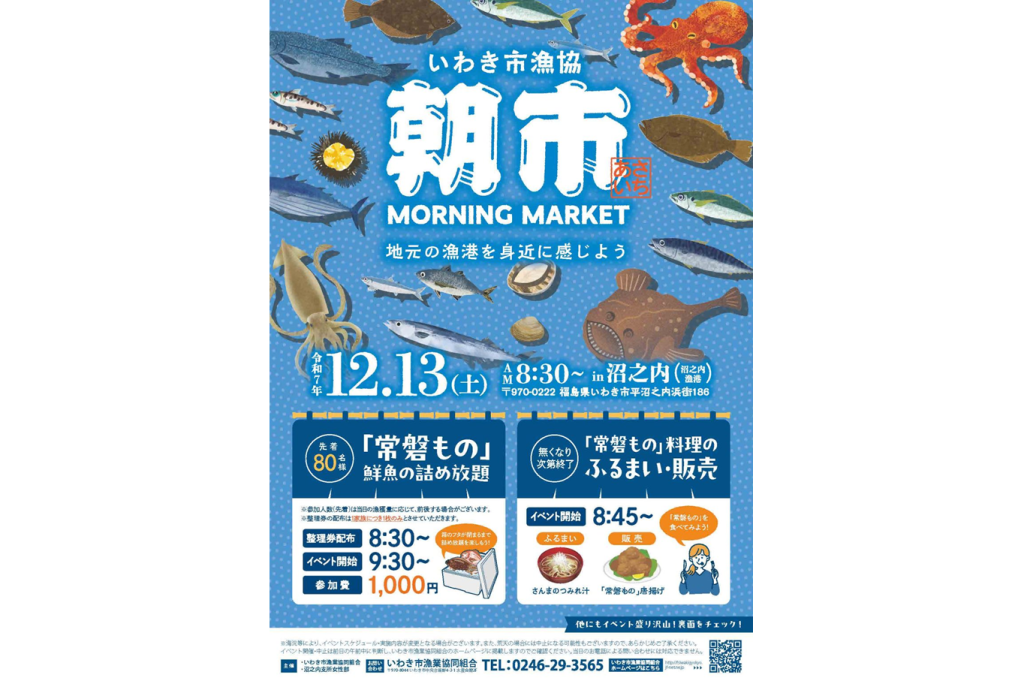 | 備考 | ※海況等により、イベントスケジュール・実施内容が変更、荒天の場合には中止となる場合もございますので、あらかじめご了承ください。 イベント開催・中止は前日の午前中に判断し、いわき市漁協組合ホームページに掲載しますのでご確認ください。当日のお電話によるお問合せには対応できません。 【主催】 いわき市漁業協同組合 沼之内支所女性部 |