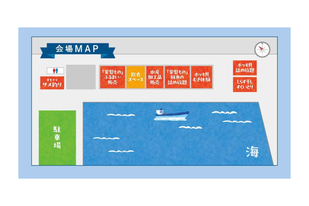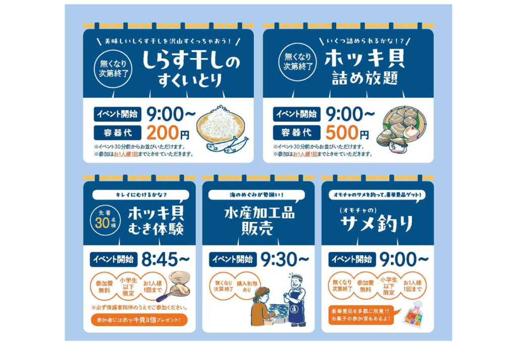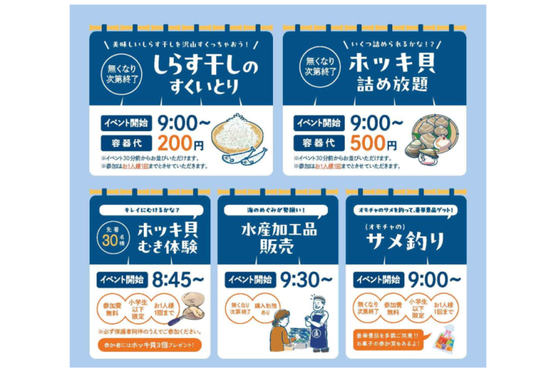 また、小学生以下のお子様を対象としたホッキ貝むき体験やオモチャのサメ釣り体験、海のめぐみが勢揃いする水産加工品の販売コーナーも設けられます。