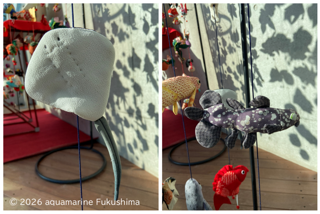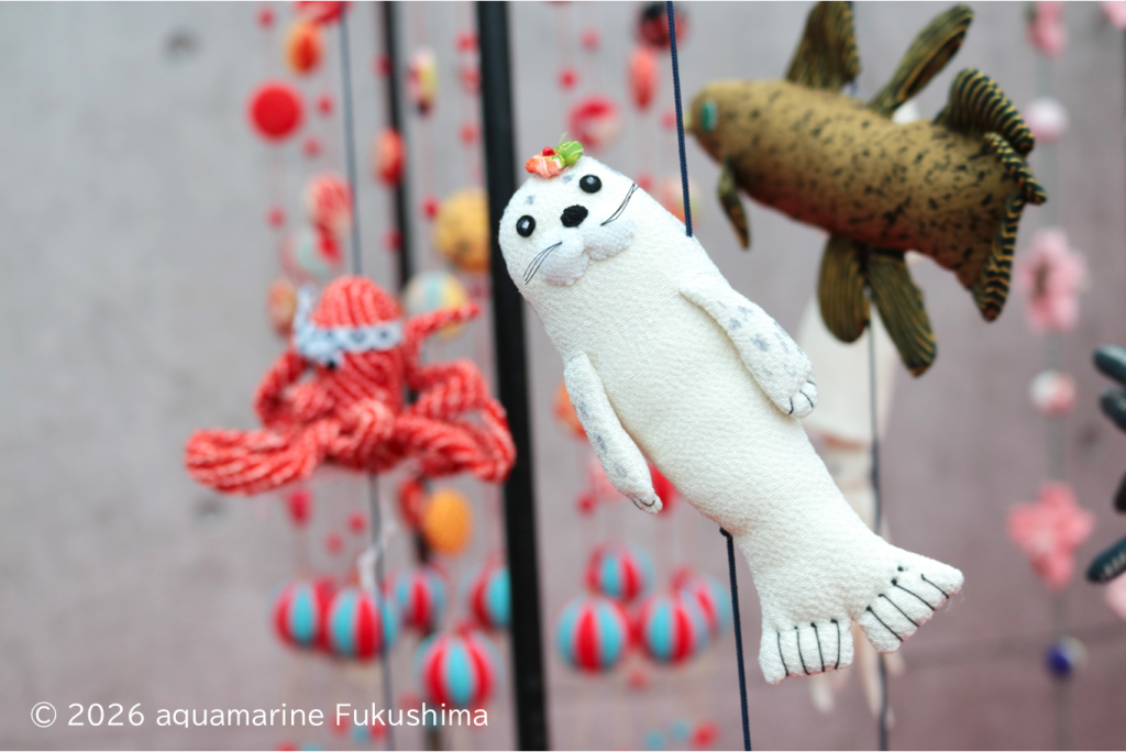 見どころは、アクアマリンふくしまならではの生き物をモチーフにした細工ものの数々です。タイや金魚といった縁起物はもちろん、アロワナ、エビ、アザラシ、チンアナゴ、さらには開館当初から調査・研究を続けている「シーラカンス」まで、ユニークな飾りがふんだんに盛り込まれています。一針一針丹精込めて作られた約1万点(予定)の作品が並ぶ様子は、まさに圧巻の一言です。