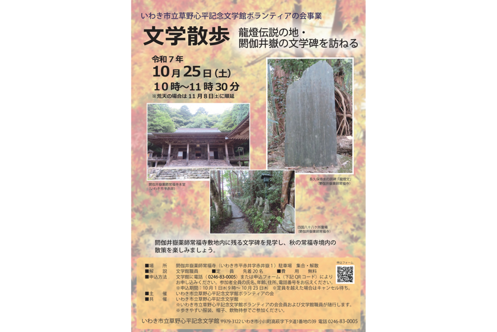 10月25日(土)、いわき市立草野心平記念文学館では、文学散歩「龍燈伝説の地・閼伽井嶽の文学碑を訪ねる」を開催いたします。閼伽井嶽薬師常福寺敷地内に残る文学碑の見学し、秋の常福寺境内の散策を楽しみましょう。歩きやすい服装、帽子、飲物持参でご参加ください。