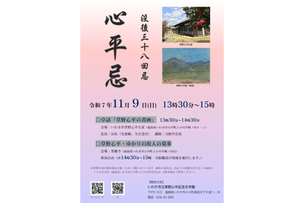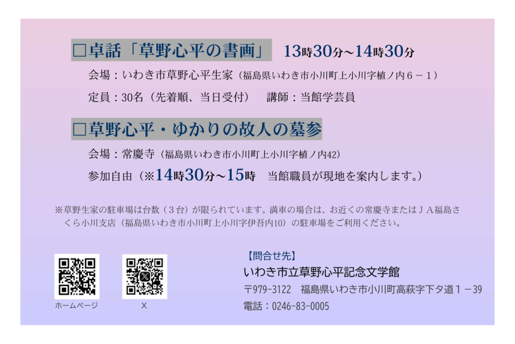 草野心平生家にて施設学芸員による卓話「草野心平の書画」が催されるほか、常慶寺にて「草野心平・ゆかりの故人の墓参」が行われます。自由参加となり、午後14時30分~15時まで施設職員が現地を案内いたします。