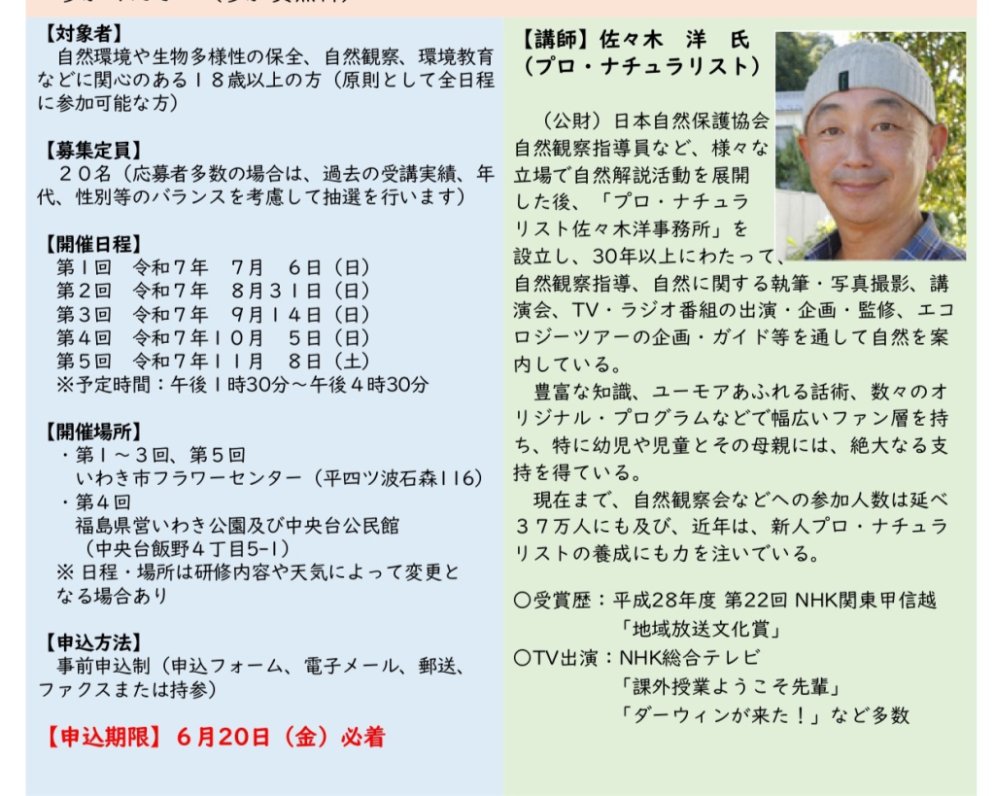 7月~11月、いわき市役所では、「令和7年度いわき市ネイチャーガイド養成研修会」全5回が開催されます。