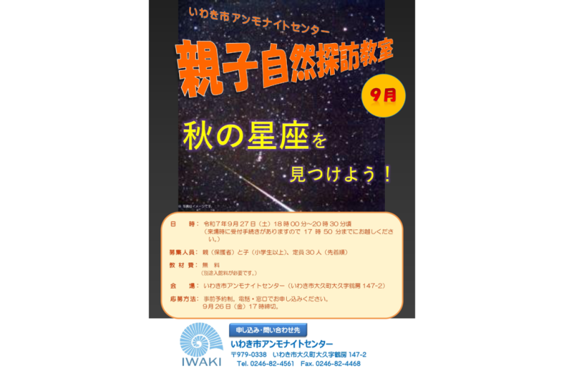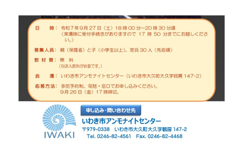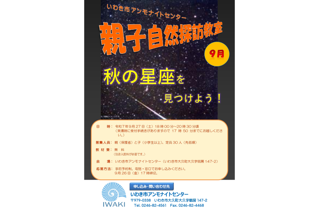 9月27日(土) いわき市アンモナイトセンターでは、親子自然探訪教室「秋の星座を見つけよう!」を開催いたします。