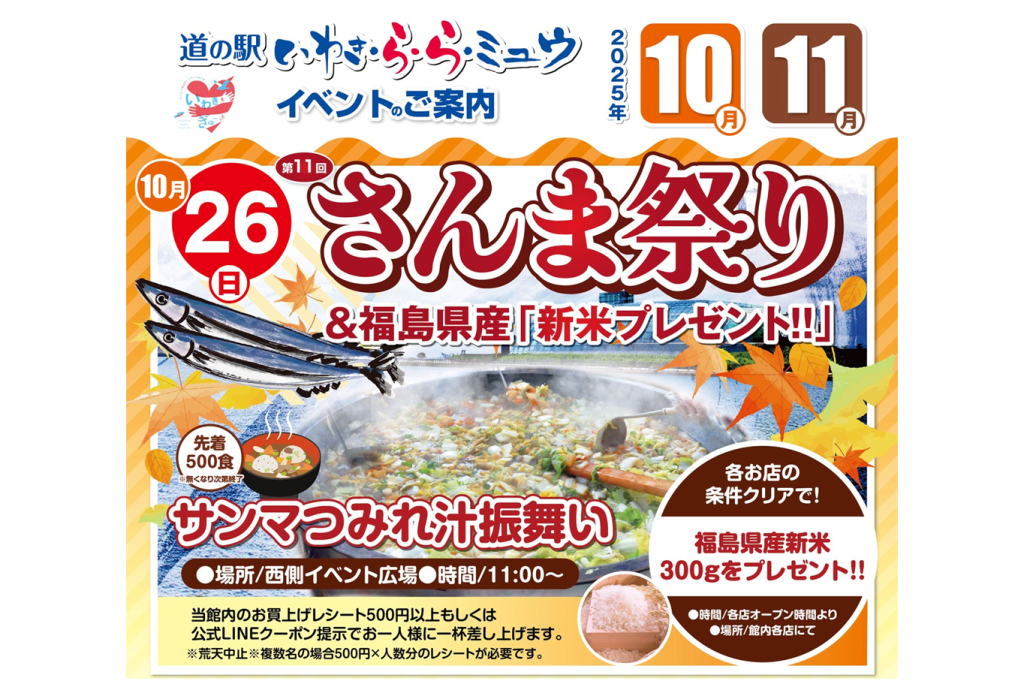 10月26日(日)、道の駅いわき・ら・ら・ミュウにて「第11回さんま祭り」開催いたします。