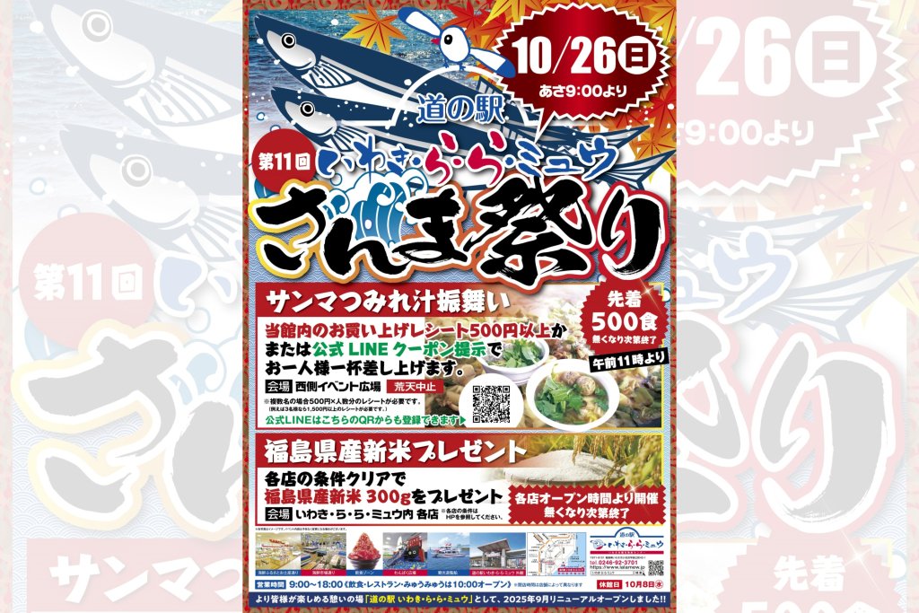 10月26日(日)、道の駅いわき・ら・ら・ミュウにて「第11回さんま祭り」が開催されます。
