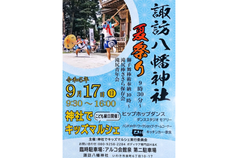 9月17日(日)、泉町の諏訪八幡神社夏祭りに合わせて、キッズマルシェを開催いたします。