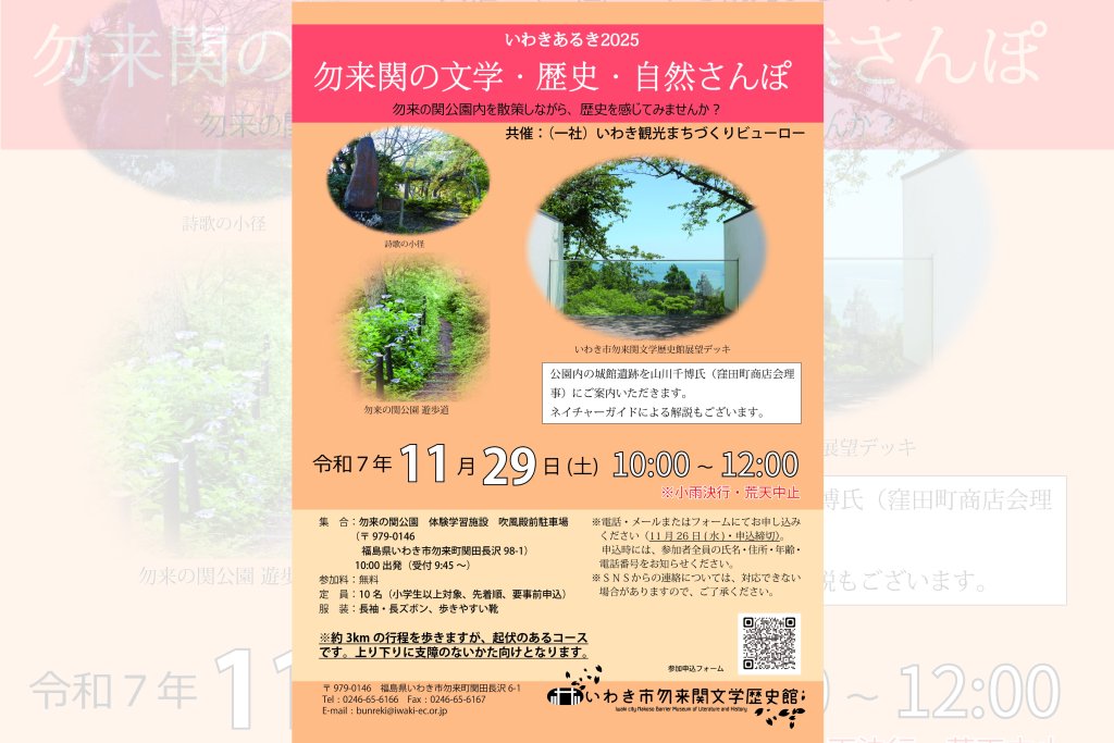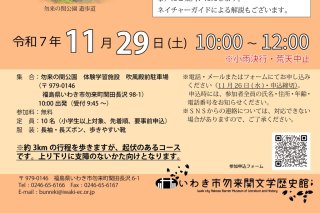 | 備考 | 当日は動きやすい服装でご参加ください。 飲み物はご持参ください。 約3㎞の工程を歩きますが、起伏のあるコースです。上り下りに支障のない方向けとなります。 【主催】いわき市勿来関文学歴史館 |