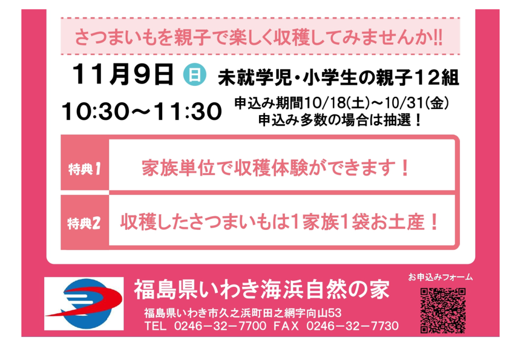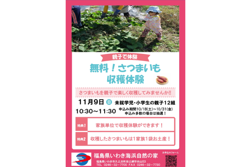 11月9日(日)、いわき海浜自然の家にて「無料!さつまいも収穫体験」を開催いたします。
