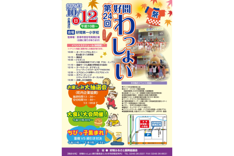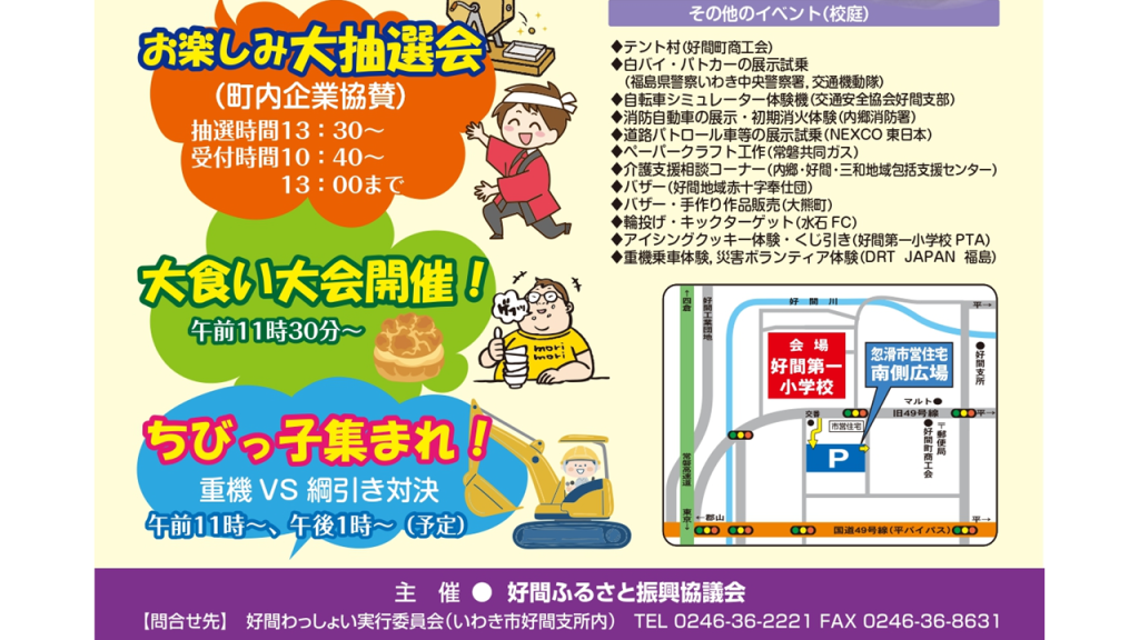校庭には様々な団体による出店や白バイなどの展示試乗、アイシングクッキーや災害ボランティアなどを体験できるコーナーもあります。体育館では保育園児による和太鼓、好間地区芸能サークルによる発表、ほかキッズエアロビック、フラやチアなどの演舞が披露されます。ほかにも午前11時30分からは大食い大会、午後1時30分から豪華景品が当たるお楽しみ大抽選会が催されます。