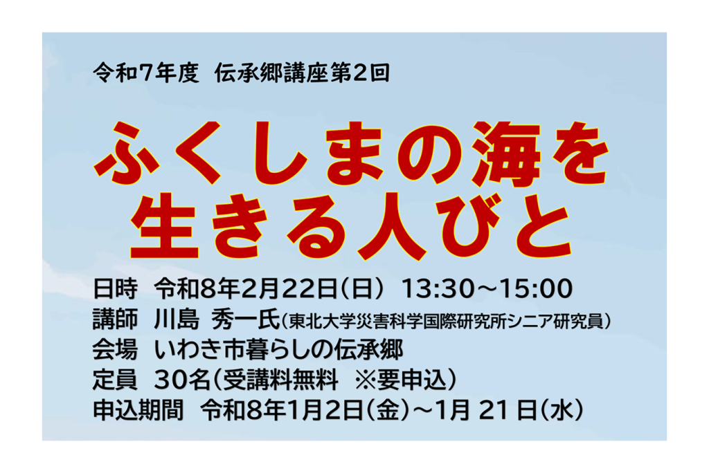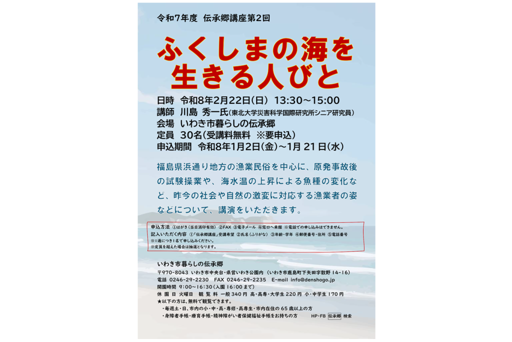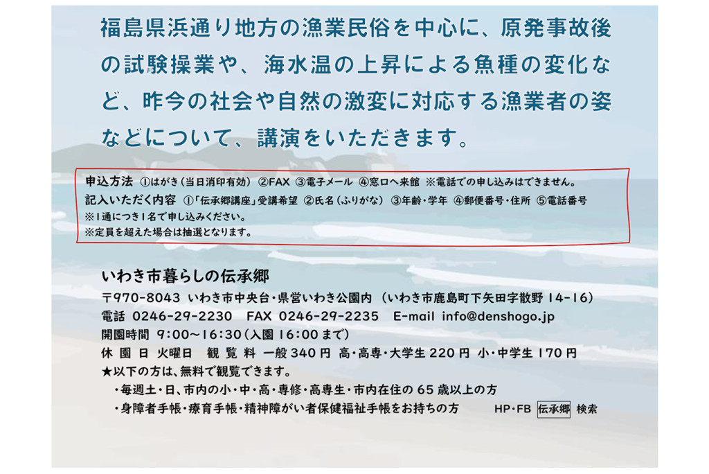 2月22日(日)、いわき市暮らしの伝承郷にて、伝承郷講座第2回「ふくしまの海を生きる人びと」を開催いたします。