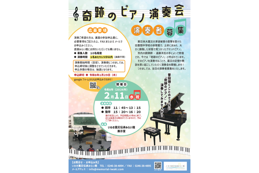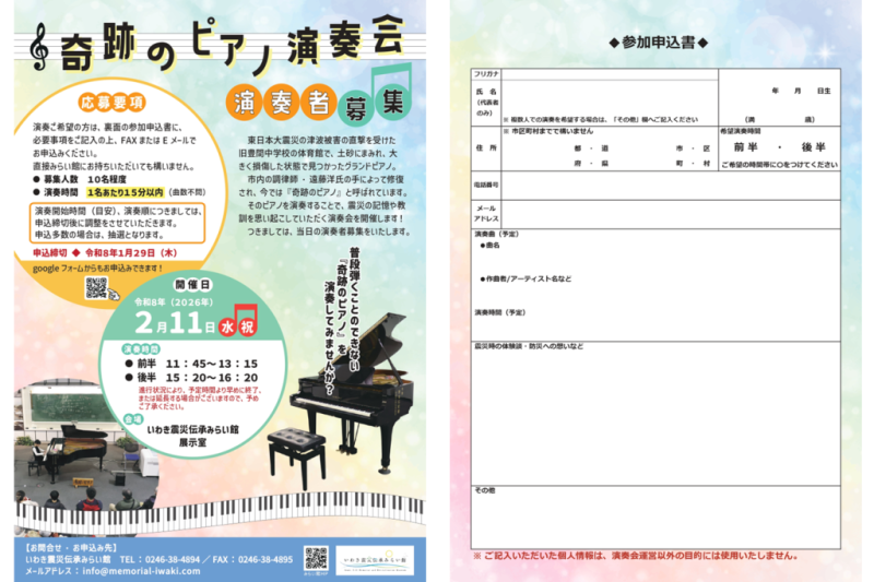 2月11日(水・祝)、いわき震災伝承みらい館では「奇跡のピアノ演奏会」を開催いたします。