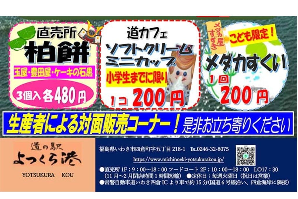 | 営業時間 | 《イベントの時間》 10:00~15:00 《道の駅よつくら港の営業時間》1F直売所9:00~18:00、2Fフードコート10:00~18:00(LO17:30) |