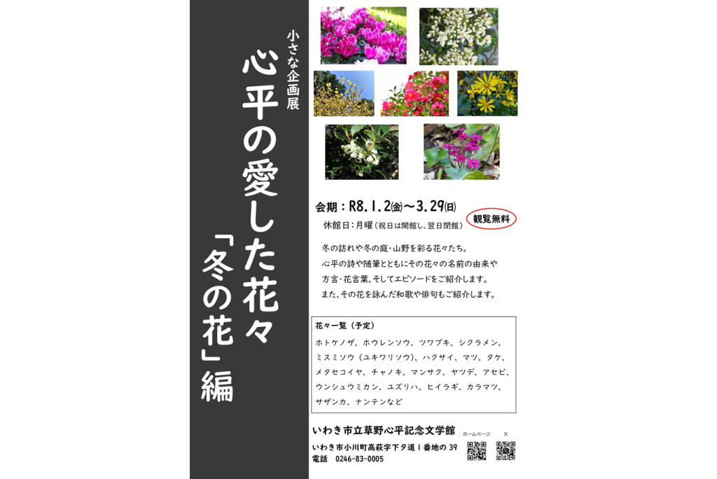1月2日(金)~3月29日(日)までの期間中、いわき市立草野心平記念文学館にて、小さな企画展「心平の愛した花々「冬の花」編」を開催いたします。