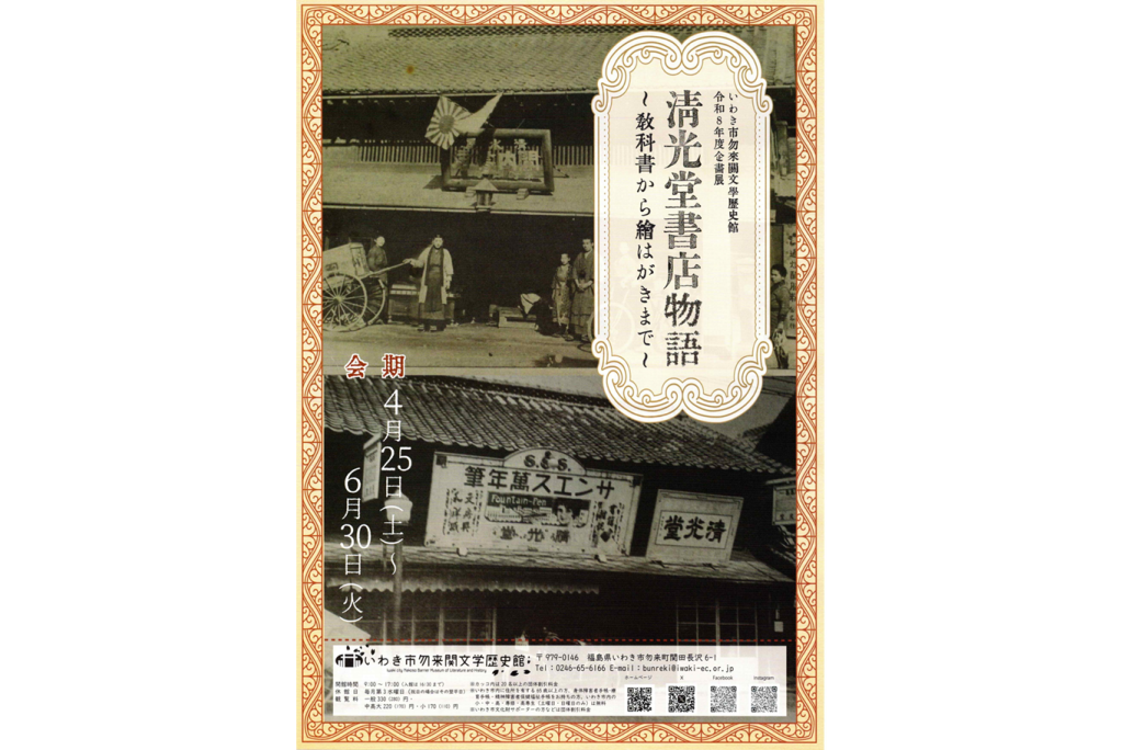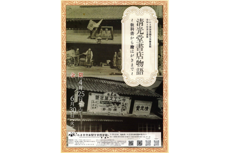 4月25日(土)〜6月30日(火))までの期間中、いわき市勿来関文学歴史館にて、令和8年度企画展「清光堂書店物語~教科書から絵はがきまで~」が開催されます。