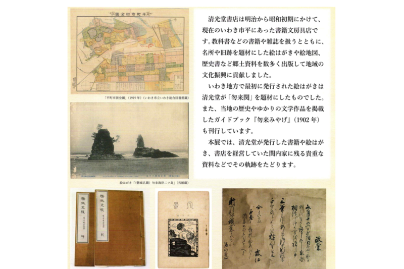 明治から大正期に現在のいわき市平で営まれた書籍文房具店「清光堂書店」の歴史を紹介するとともに、絵葉書や書籍などの関連資料を展示します。