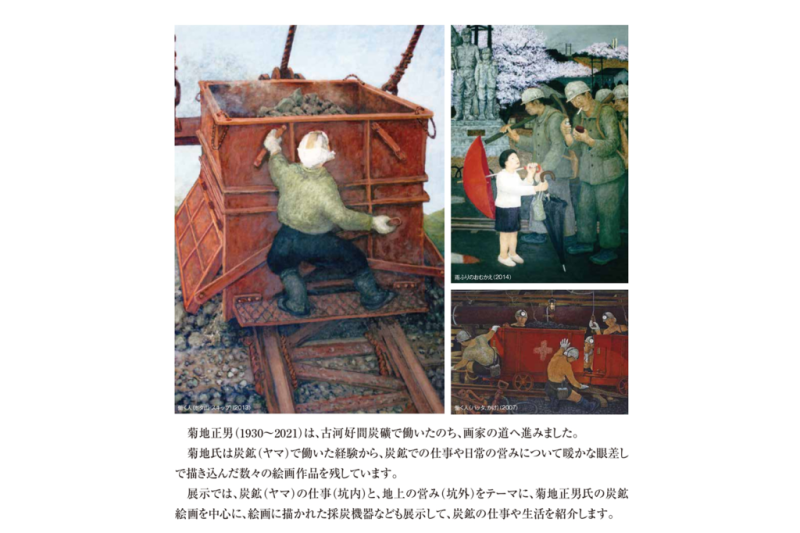 菊地氏は炭鉱(ヤマ)で働いた経験から、炭鉱での仕事や日常の営みについて暖かな眼差しで描き込んだ数々の絵画作品を残しています。