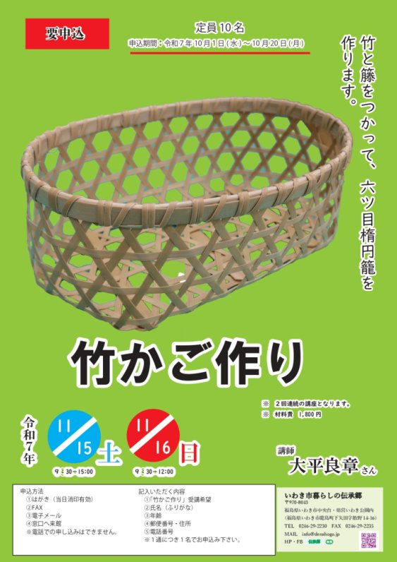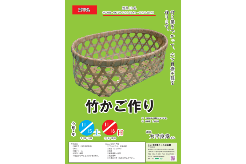 11月15日(土)・16日(日)の2日間、いわき市暮らしの伝承郷にて、体験学習「竹かご作り」を開催いたします。