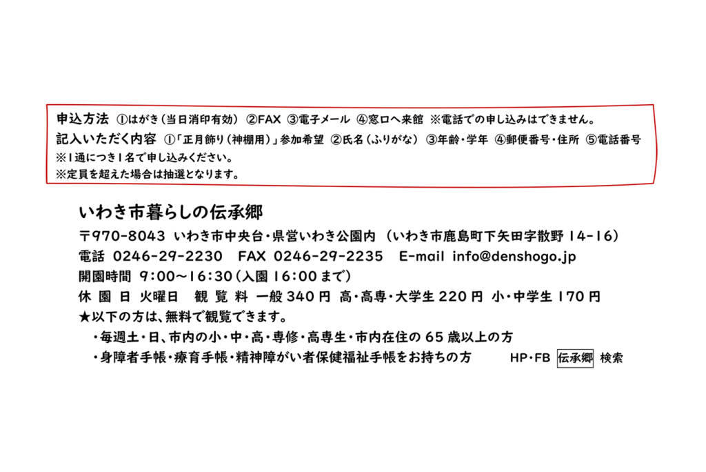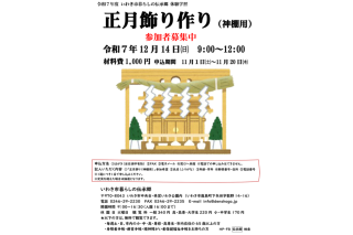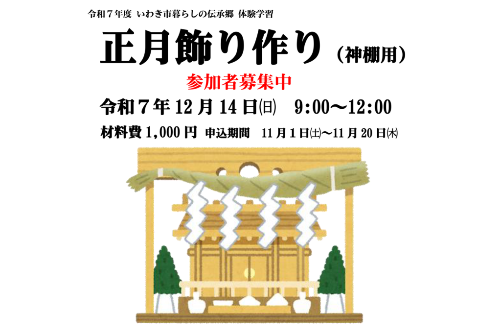 12月14日(日)、いわき市暮らしの伝承郷にて体験学習「正月飾り作り(神棚用)」を開催いたします。
