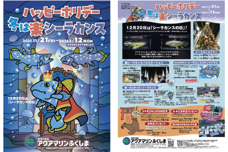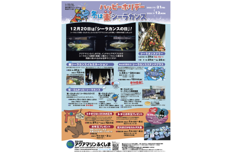 11月21日(金)~2026年1月12日(月・祝)までの期間中、アクアマリンふくしまにて冬休みイベント「ハッピーホリデー! 冬は楽(たの)シーラカンス」を開催します。