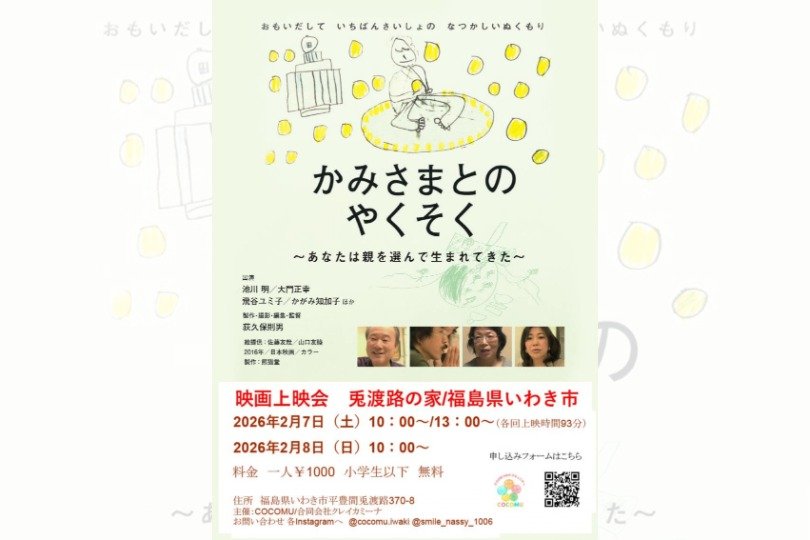 2月7日(土)、8日(日)、兎渡路の家にて、ドキュメンタリー映画「かみさまとのやくそく」自主上映会が開催されます。