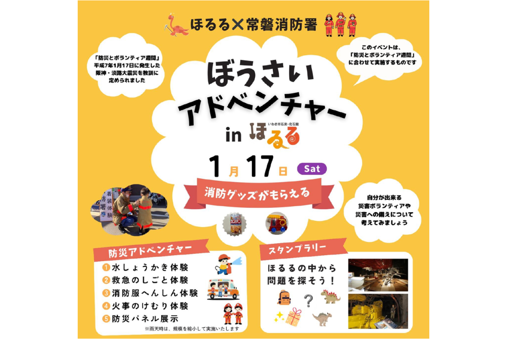 1月17日(土)、いわき市石炭・化石館 ほるるにて「ぼうさいアドベンチャー in ほるる」 を開催いたします。