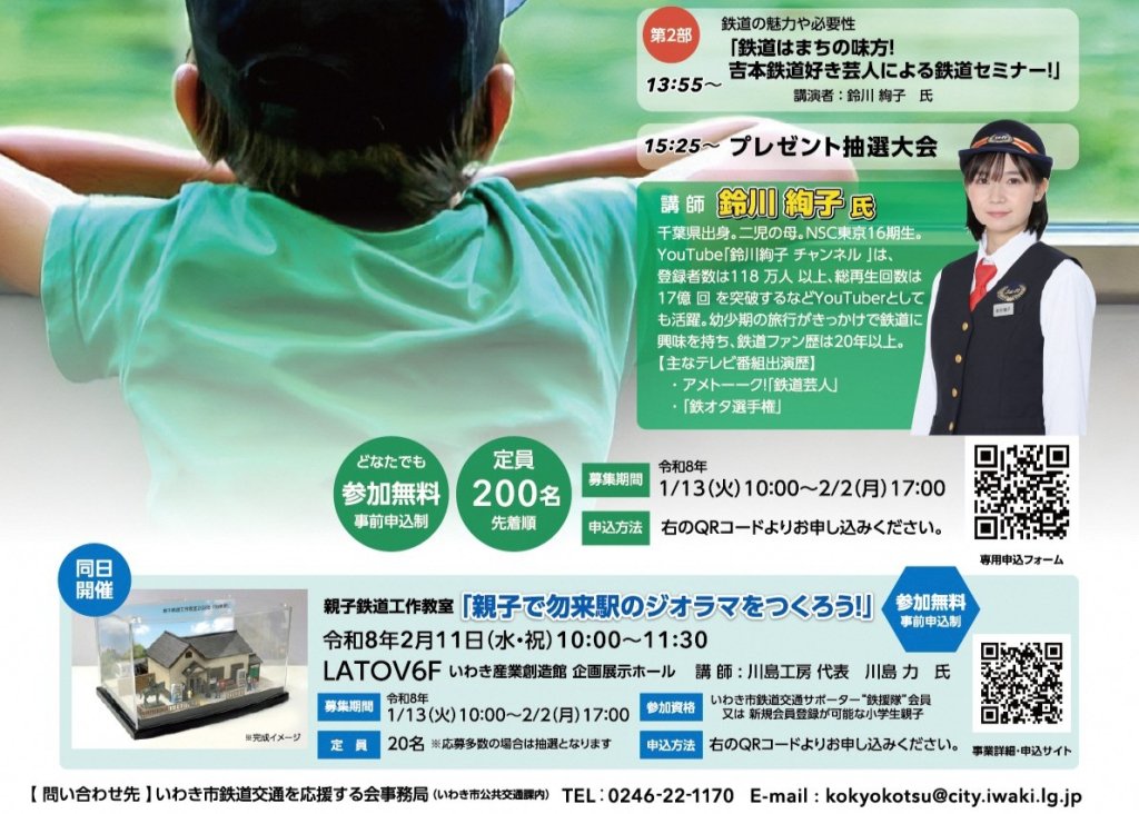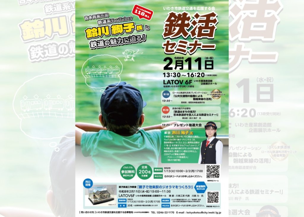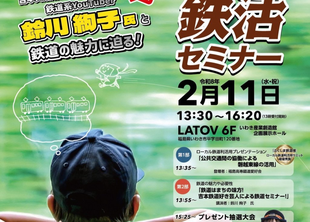 「鉄活セミナー」では、吉本興業所属 お笑いタレント・鉄道keiyoutuberの鈴川絢子氏と、「ふくしま鉄道博ローカル鉄道利活用サミット」にて最優秀賞を受賞した福島高専鐵道愛好会によるプレゼンテーションが実施され、鉄道交通に関する知識を身につけ、鉄道を守り育む意識の醸成や鉄道交通の利用促進を目的とした、鉄道をテーマとする鉄活セミナーを開催します。