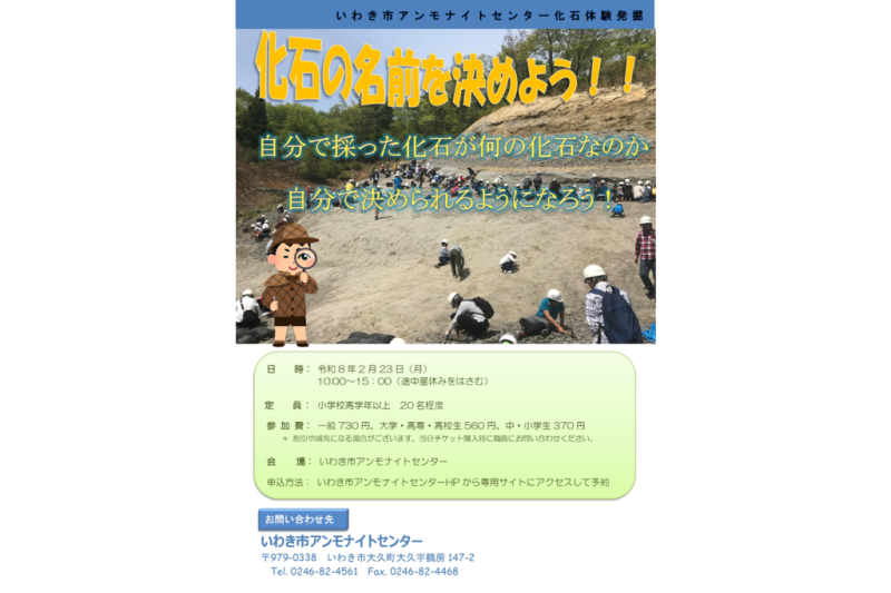 2月23日(月・祝)、いわき市アンモナイトセンターでは、化石体験発掘イベント「化石の名前を決めよう!!」を開催いたします。