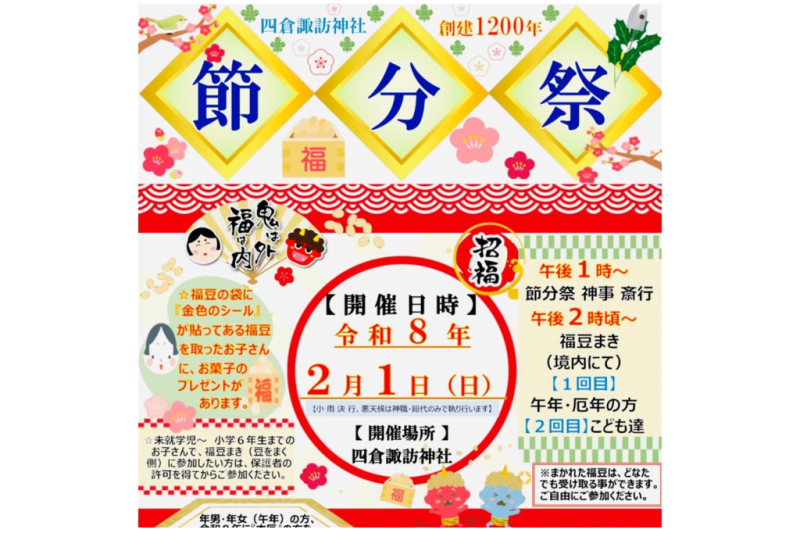 2月1日(日)、四倉諏訪神社にて節分祭(福豆まき)を行います。