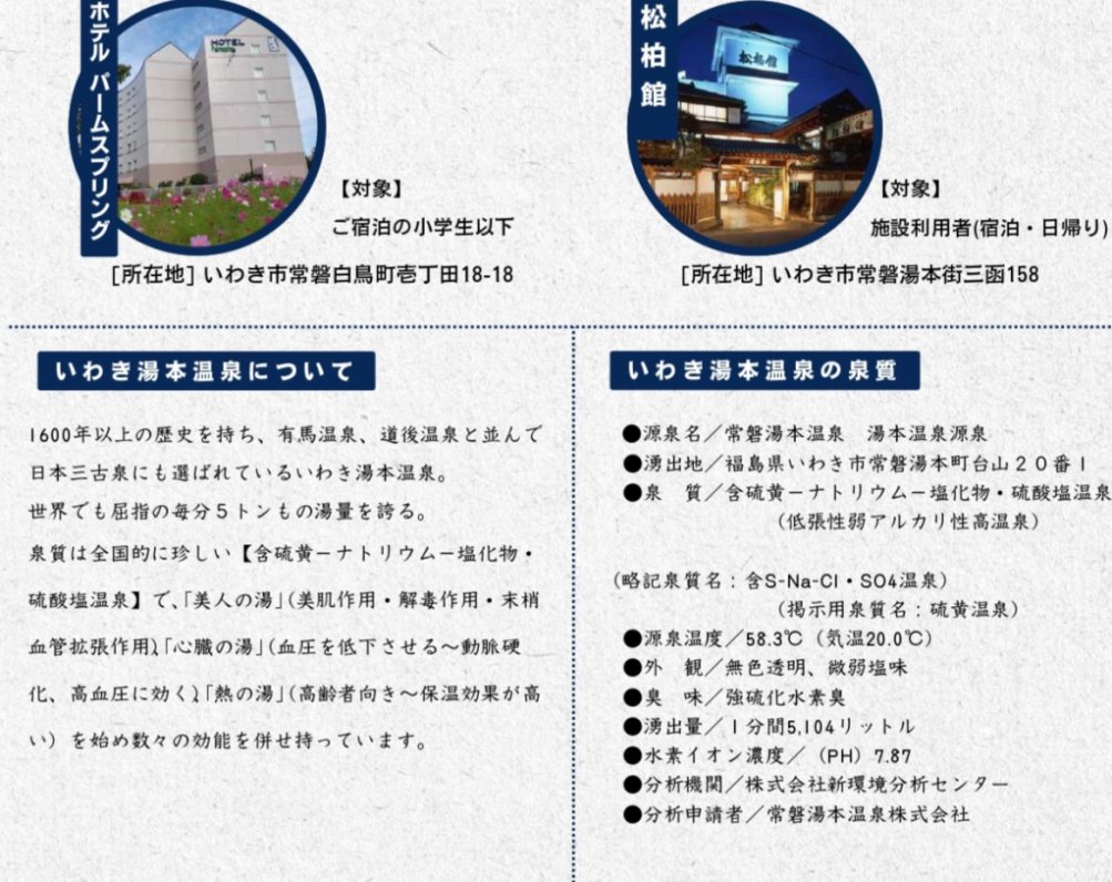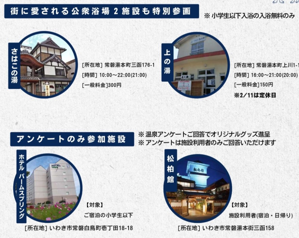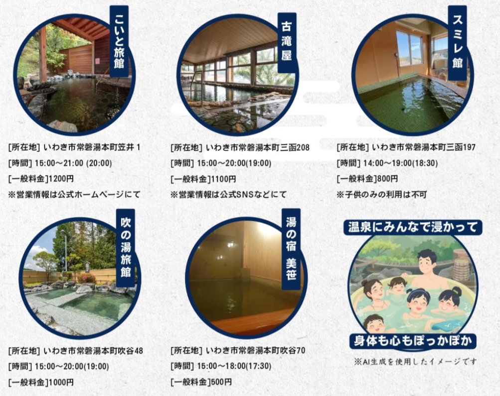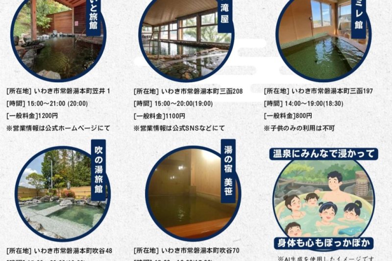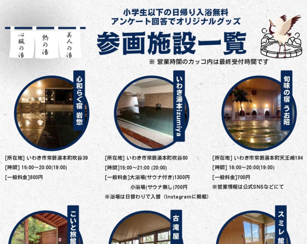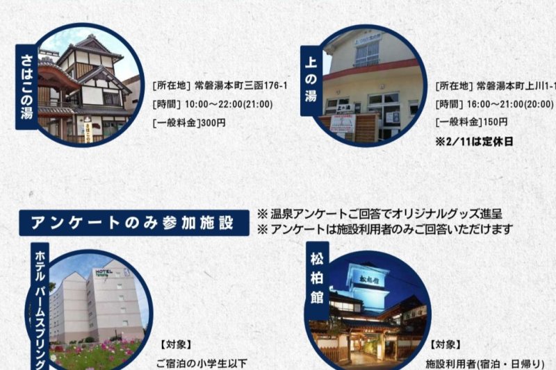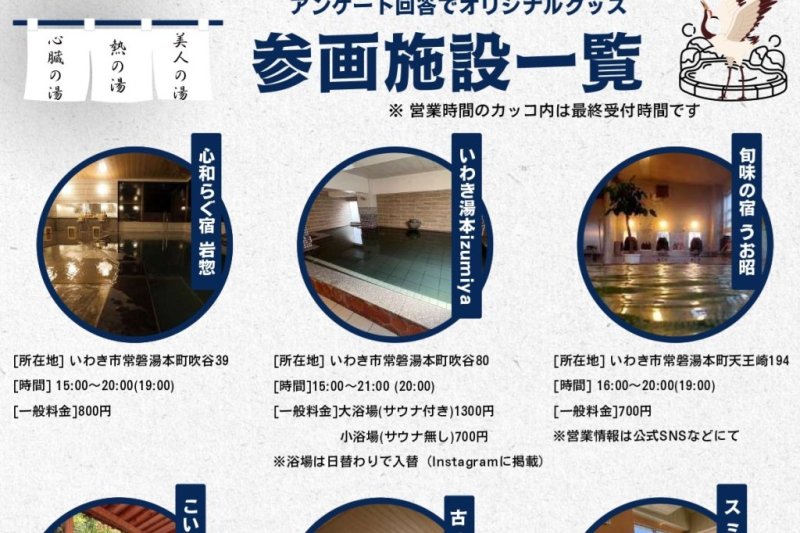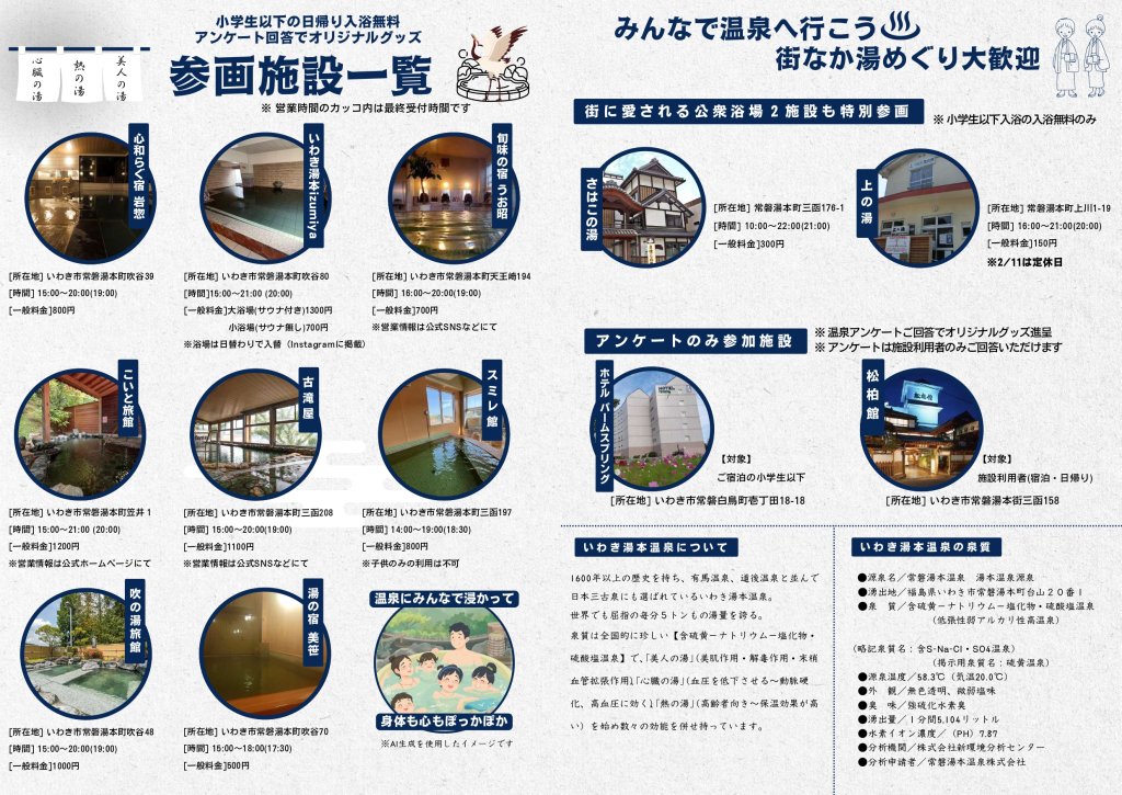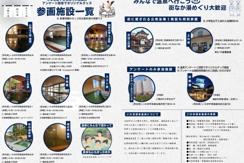 | 備考 | ※入浴料金、営業時間等は各施設へご確認ください。 主催:いわき湯本温泉旅館協同組合 |