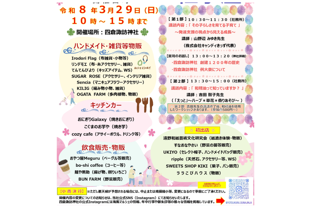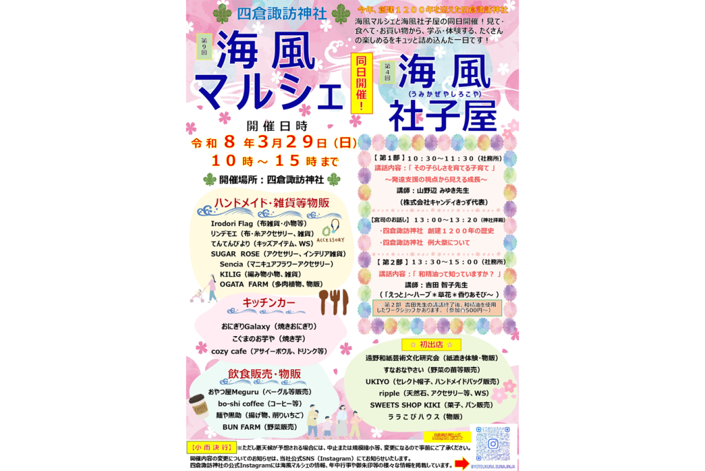 3月29日(日)、四倉諏訪神社にて「第9回海風マルシェ」「第4回海風社子屋」を初の試みで同日開催いたします。