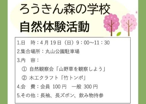 4月19日(日)、丸山公園周辺にて、ろうきん森の学校「自然体験活動」が開催されます。