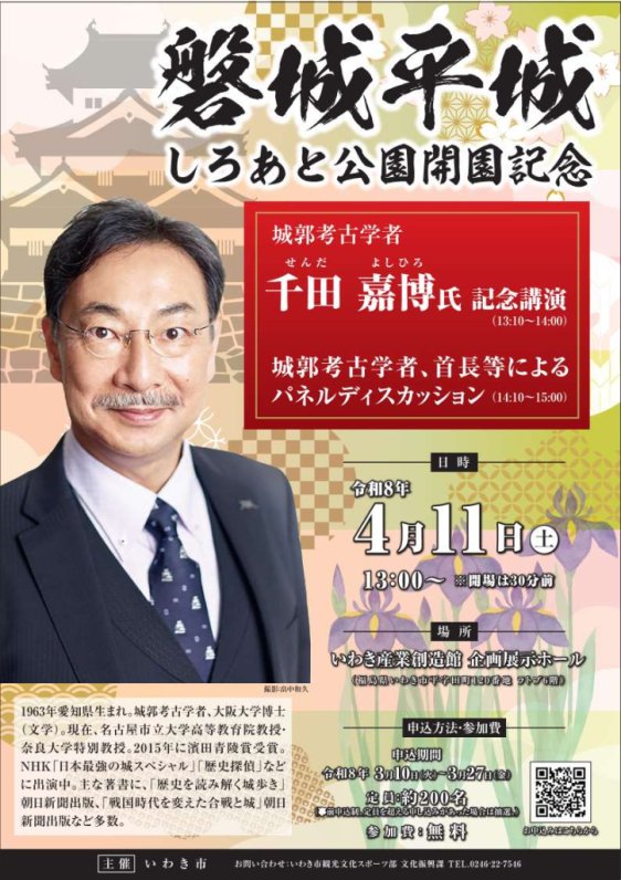 本市の貴重な歴史的資源である磐城平城本丸跡地の魅力を広く市内外に発信するため、記念イベント(記念講演及びパネルディスカッション)を開催します。