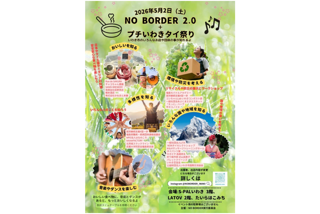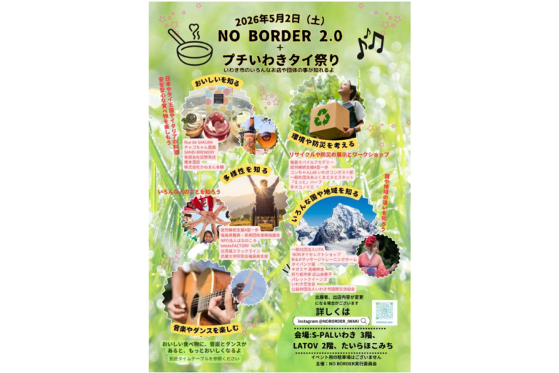 5月2日(土)、エスパルいわき・ラトブ(2階特設会場)・たいらほこみちの3会場にて「NO BORDER2.0+タイ祭り」を開催いたします。