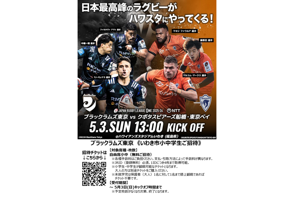 対戦カードは、NTTジャパンラグビー リーグワン2025-26 ディビジョン1 第17節、リコーブラックラムズ東京対クボタスピアーズ船橋・東京ベイです。福島県内での開催は昨シーズンのJヴィレッジスタジアムに続き2回目となり、当日は市長も来場して試合前に挨拶を行うなど、市を挙げた特別な一戦となります。