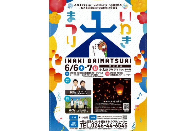 | 備考 | 【スカイランタンに関するお問い合わせ】 いわき大まつり スカイランタン事業 運営・管理/ 株式会社アド・プラン 株式会社アド・プラン 事業担当メール iwaki.daimatsuri@ad-plan.co.jp ※お電話でのイベント申込みは受付しておりません。 【主催】いわき市 |