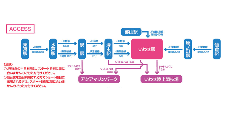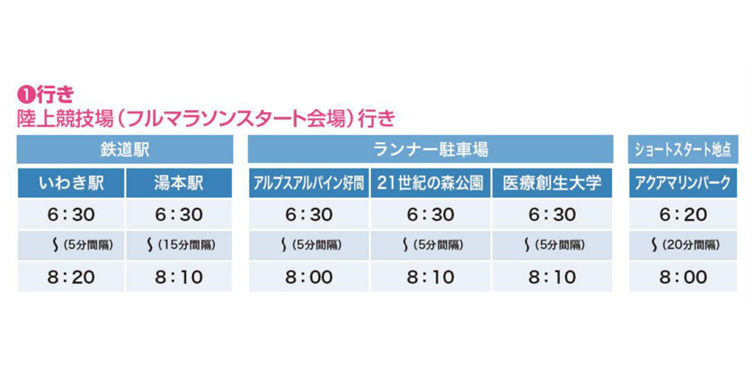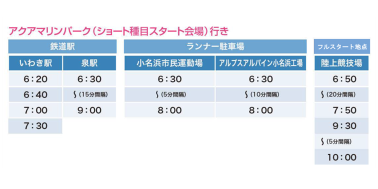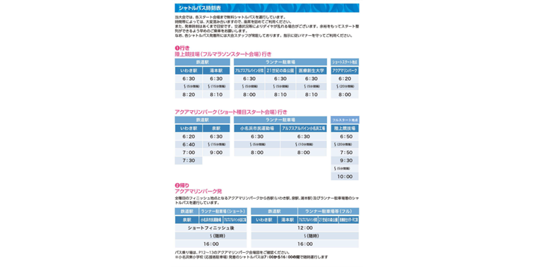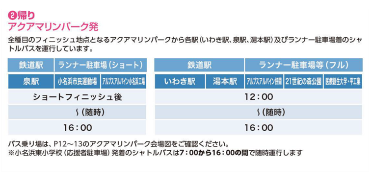 全種目のフィニッシュ地点となるアクアマリンパークから各駅(いわき駅、泉駅、湯本駅)及びランナー駐車場着のシャトルバスを運行しています。