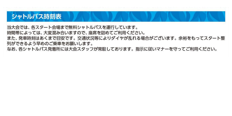 ・ランナー駐車場からスタート会場、ゴール会場からランナー駐車場まで、ご家族や応援者も利用できるシャトルバスを運行します。