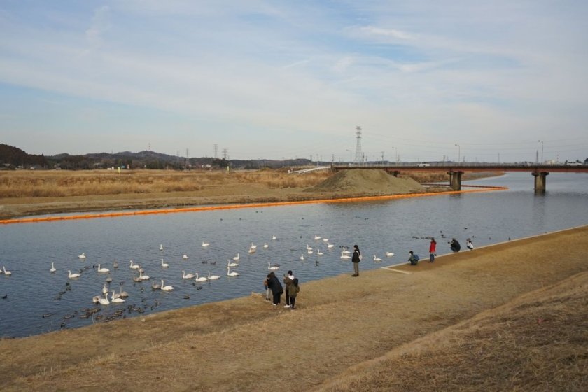 公園のある場所から鮫川大橋をくぐった先の方に、白鳥たちがいるのが見えます。1羽だけ公園近くにやってきた白鳥がいたので、運がよければ近くで観察できますね。