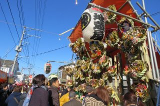 毎年1月10日の例大祭は「初こんぴら」とも言われ、海上安全、商売繁盛を願い、福だるま(いわきだるま)や熊手を買い求める人で賑わいます。付近の道路は早朝から深夜まで通行止めになり、約400軒の露店が軒を並べます。